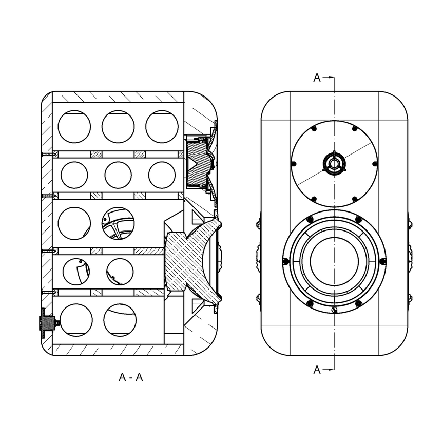 The cabinet has been shaped to ensure that the acoustic performance of the woofer and tweeter isn’t negatively affected by the cabinet, hence the large fillet / round -over on corners. This enables the speaker to have a very wide and smooth dispersion pattern with a ±70 deg beam width up to past 15 kHz.